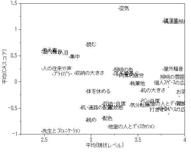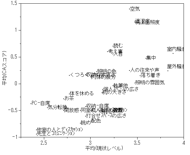 対応分析の項目のスコア(あるいは、当たり前を4点、一元的を3点、魅力的を2点、無関心を1点として計算される各項目の回答者平均点)を縦軸、各項目の評価(満足度や良い悪い)の回答者平均点を横軸にとって、評価項目をプロットしてみる。ある2つの院生室の結果を例示する。
