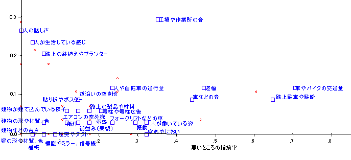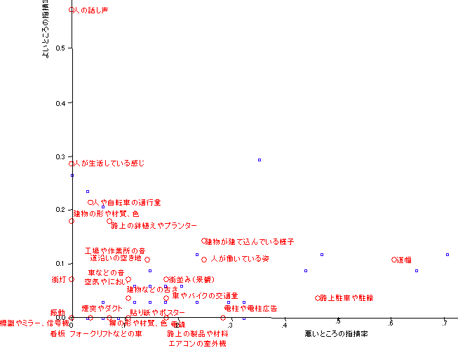 ・複数選択式あるいは自由記述で、対象とする空間・地域・商品などの「よいところ」「悪いところ」の回答を求める。(自由記述の場合は適宜カテゴライズした後、)縦横の軸に「よいところ」「悪いところ」の指摘頻度をとり、項目をプロットする。