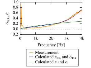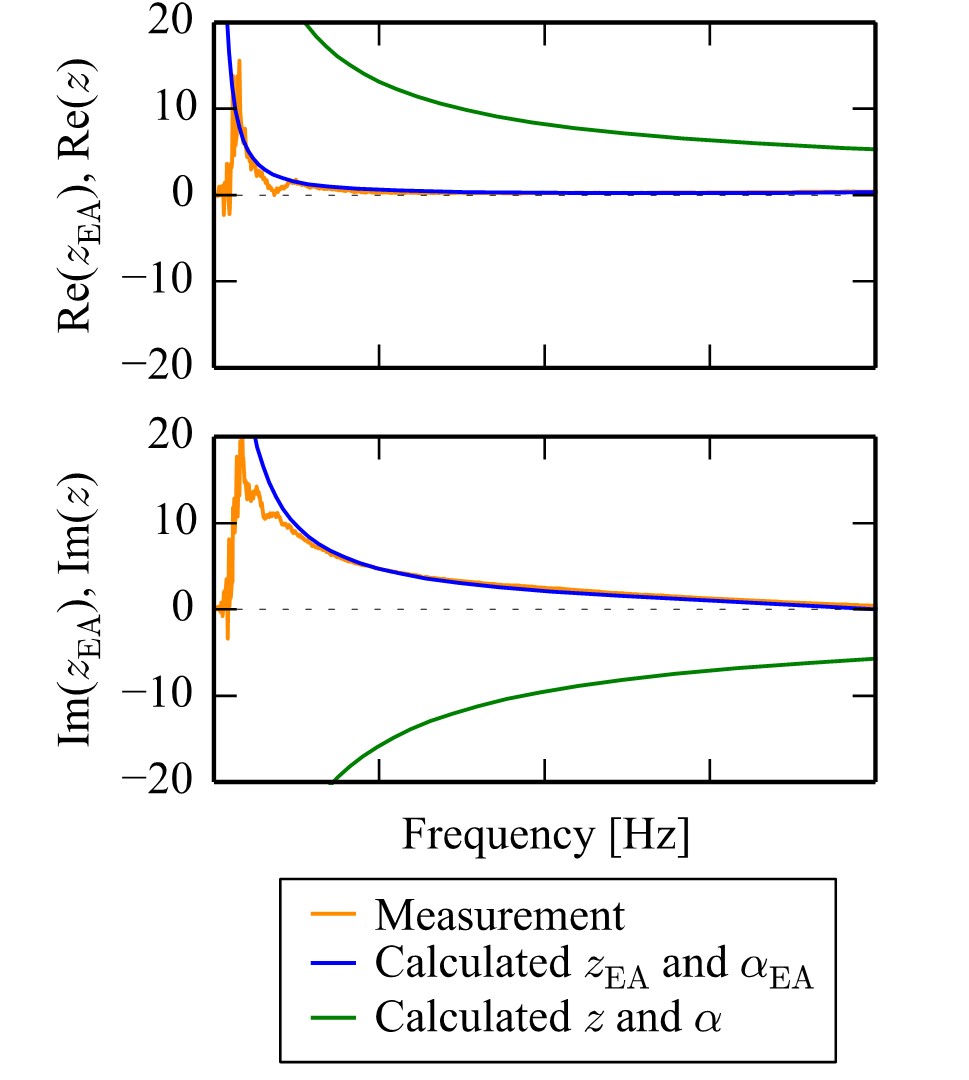 垂直入射比音響インピーダンス比(実部・虚部)および垂直入射吸音率の計測結果を示す。なお、これらの結果は、24点の受音点における推定結果の平均値を示している。