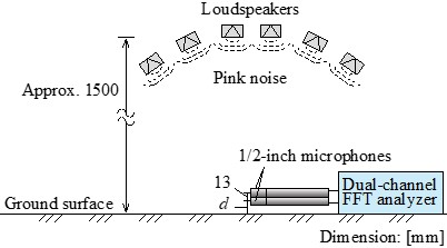 Fig. 1に機材配置を示す。移動音源として小型ポータブルスピーカ6~8個を使用し,ピンクノイズを出力する。受音には1/2インチマイクロホンを使用し,FFT分析器により2マイクロホン間の伝達関数を測定する。上限周波数は5 kHz,周波数間隔は3.125 Hz,スペクトルの平均回数は150回とする。2マイクロホン間距離はいずれの測定においても13 mmとする。地表面–下側マイクロホン中心間距離dは15 mmとする。 地表面24点を測定する。垂直方向(ノーマル)比音響インピーダンス比は,各点の比音響インピーダンス比の算術平均によって求める。吸音率は,各点の垂直方向(ノーマル)比音響インピーダンス比から求められるアドミッタンスを算術平均し,得られたアドミッタンス平均値から求める。