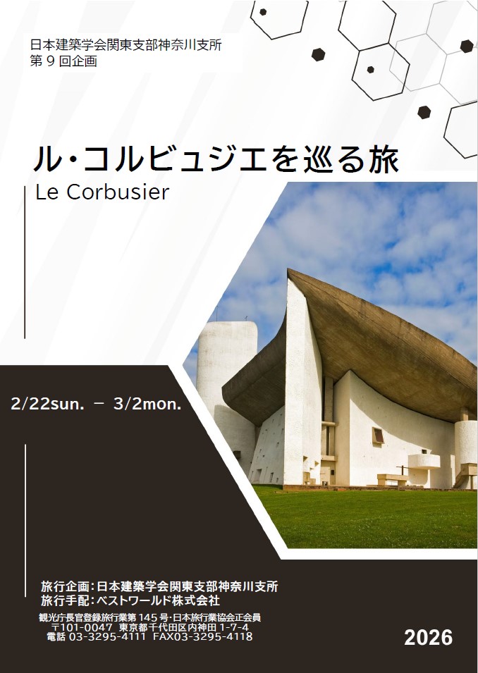 ![]() 日本建築学会関東支部神奈川支所では、「空間の魅力」をテーマに2008年より海外建築視察を継続して実施してまいりました。 これまで、韓国(2008)、ネパール(2010)、インド(2012)、フランス・スイス(2014)、チベット・中国(2017)、ドイツ・オランダ(2019)、ウィーン・プラハ(2022)、そしてフィンランド(2024)へと足を運び、アジアとヨーロッパの双方を横断しながら、モダニズム建築が育まれた多様な文化的背景と、その空間体験を深めてきました。 第9回となる今回は、再びフランス・スイスへと向かいます。コルビュジエが提唱した「近代建築五原則」をはじめ、住居と都市の関係、合理的構造、自然光の扱いなど、現代建築の基盤を築いた理念を実作を通して再考する貴重な機会となるでしょう。図面や写真だけでは捉えきれない「スケール」「光」「動線」「居住性」を身体的に理解するための旅です。 ※学会会員でなくてもご参加いただけます。 期 間 2026年2月22日(日)〜3月2日(月) 費 用 ¥429,000− *上記金額は25名以上参加時の二人部屋での算出料金です。 募集人員 25名〜30名(参加者が少ない場合は取りやめになる事があります) 旅行会社 ベストワールド(株) 東京都千代田区内神田1-7-4 TEL 03-3295-4111 申込み 下記実施要領(PDF)に記載のQRコードより、12月25日(木)までに各自で旅行会社にお申し込みください。 (定員に達した場合は期日前でも締め切ります。ご承知ください。) 同時に申込金¥50,000のお振込みをお願いいたします。 TEL 03−3295−4111 FAX 03−3295−4118 (ル・コルビュジエを巡る旅係) ◎詳細はこちらをご参照ください。 ・実施要綱(PDF) | ||